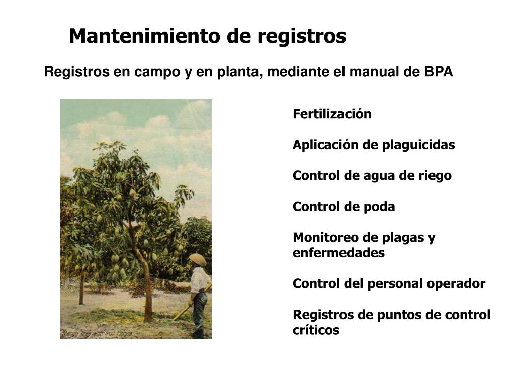 Mantenimiento de registros Registros en campo y en planta, mediante el manual de BPA Fertilización Aplicación de plaguicidas Control de agua de riego Control de poda Monitoreo de plagas y enfermedades Control del personal operador Registros de puntos de control críticos