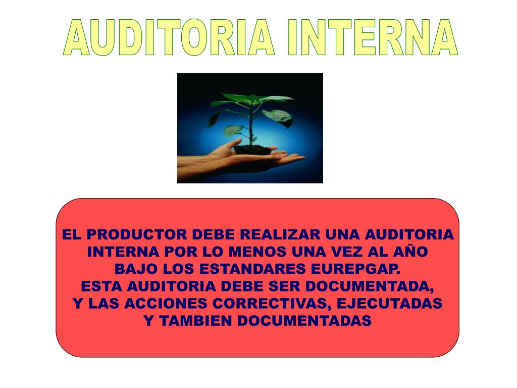 AUDITORIA INTERNA EL PRODUCTOR DEBE REALIZAR UNA AUDITORIA INTERNA POR LO MENOS UNA VEZ AL AÑO BAJO LOS ESTANDARES EUREPGAP. ESTA AUDITORIA DEBE SER DOCUMENTADA, Y LAS ACCIONES CORRECTIVAS, EJECUTADAS Y TAMBIEN DOCUMENTADAS