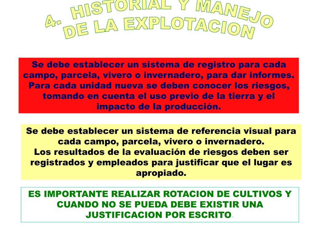 4. HISTORIAL Y MANEJO DE LA EXPLOTACION Se debe establecer un sistema de registro para cada campo, parcela, vivero o invernadero, para dar informes. Para cada unidad nueva se deben conocer los riesgos, tomando en cuenta el uso previo de la tierra y el impacto de la producción. Se debe establecer un sistema de referencia visual para cada campo, parcela, vivero o invernadero. Los resultados de la evaluación de riesgos deben ser registrados y empleados para justificar que el lugar es apropiado. ES IMPORTANTE REALIZAR ROTACION DE CULTIVOS Y CUANDO NO SE PUEDA DEBE EXISTIR UNA JUSTIFICACION POR ESCRITO.