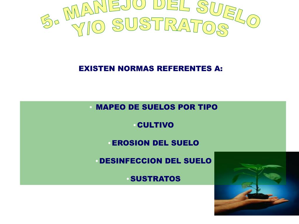5. MANEJO DEL SUELO Y/O SUSTRATOS EXISTEN NORMAS REFERENTES A: • MAPEO DE SUELOS POR TIPO • CULTIVO • EROSION DEL SUELO • DESINFECCION DEL SUELO • SUSTRATOS