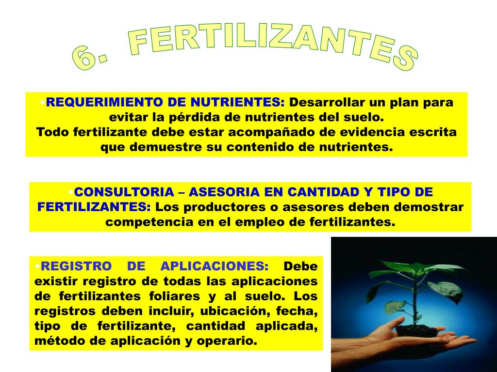 6. FERTILIZANTES • REQUERIMIENTO DE NUTRIENTES:Desarrollar un plan para evitar la pérdida de nutrientes del suelo. Todo fertilizante debe estar acompañado de evidencia escrita que demuestre su contenido de nutrientes. • CONSULTORIA – ASESORIA EN CANTIDAD Y TIPO DE FERTILIZANTES: Los productores o asesores deben demostrar competencia en el empleo de fertilizantes. • REGISTRO DE APLICACIONES:Debe existir registro de todas las aplicaciones de fertilizantes foliares y al suelo. Los registros deben incluir, ubicación, fecha, tipo de fertilizante, cantidad aplicada, método de aplicación y operario.
