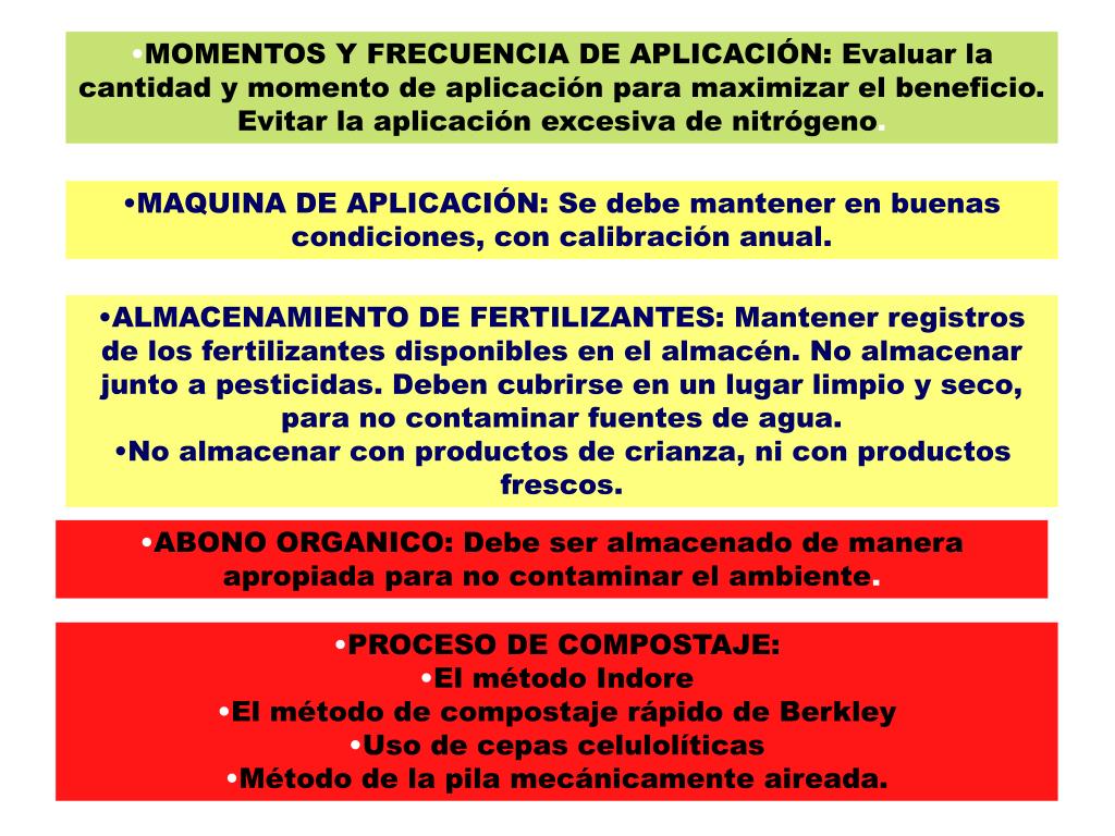 MOMENTOS Y FRECUENCIA DE APLICACIÓN: Evaluar la cantidad y momento de aplicación para maximizar el beneficio. • Evitar la aplicación excesiva de nitrógeno. • MAQUINA DE APLICACIÓN: Se debe mantener en buenas condiciones, con calibración anual. • ALMACENAMIENTO DE FERTILIZANTES: Mantener registros de los fertilizantes disponibles en el almacén. No almacenar junto a pesticidas. Deben cubrirse en un lugar limpio y seco, para no contaminar fuentes de agua. • No almacenar con productos de crianza, ni con productos frescos. • ABONO ORGANICO: Debe ser almacenado de manera apropiada para no contaminar el ambiente. • PROCESO DE COMPOSTAJE: • El método Indore • El método de compostaje rápido de Berkley • Uso de cepas celulolíticas • Método de la pila mecánicamente aireada.