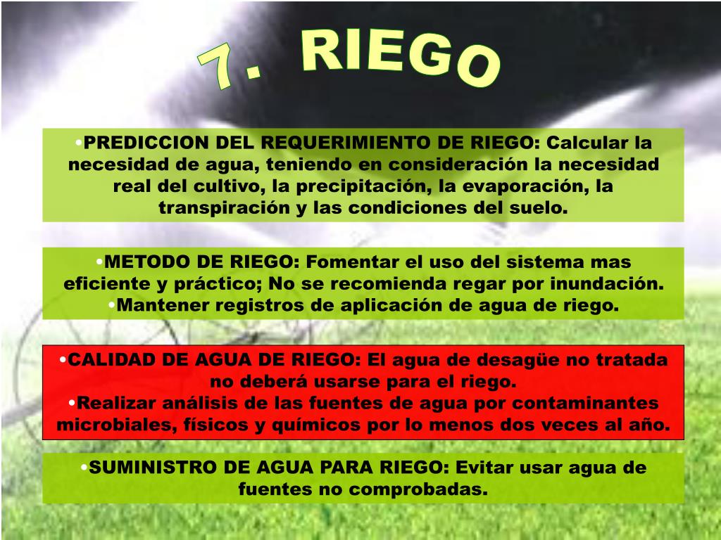 7. RIEGO • PREDICCION DEL REQUERIMIENTO DE RIEGO: Calcular la necesidad de agua, teniendo en consideración la necesidad real del cultivo, la precipitación, la evaporación, la transpiración y las condiciones del suelo. • METODO DE RIEGO: Fomentar el uso del sistema mas eficiente y práctico; No se recomienda regar por inundación. • Mantener registros de aplicación de agua de riego. • CALIDAD DE AGUA DE RIEGO: El agua de desagüe no tratada no deberá usarse para el riego. • Realizar análisis de las fuentes de agua por contaminantes microbiales, físicos y químicos por lo menos dos veces al año. • SUMINISTRO DE AGUA PARA RIEGO: Evitar usar agua de fuentes no comprobadas.