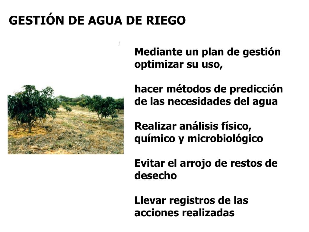 GESTIÓN DE AGUA DE RIEGO • : • Mediante un plan de gestión optimizar su uso, • hacer métodos de predicción de las necesidades del agua • Realizar análisis físico, químico y microbiológico • Evitar el arrojo de restos de desecho • Llevar registros de las acciones realizadas