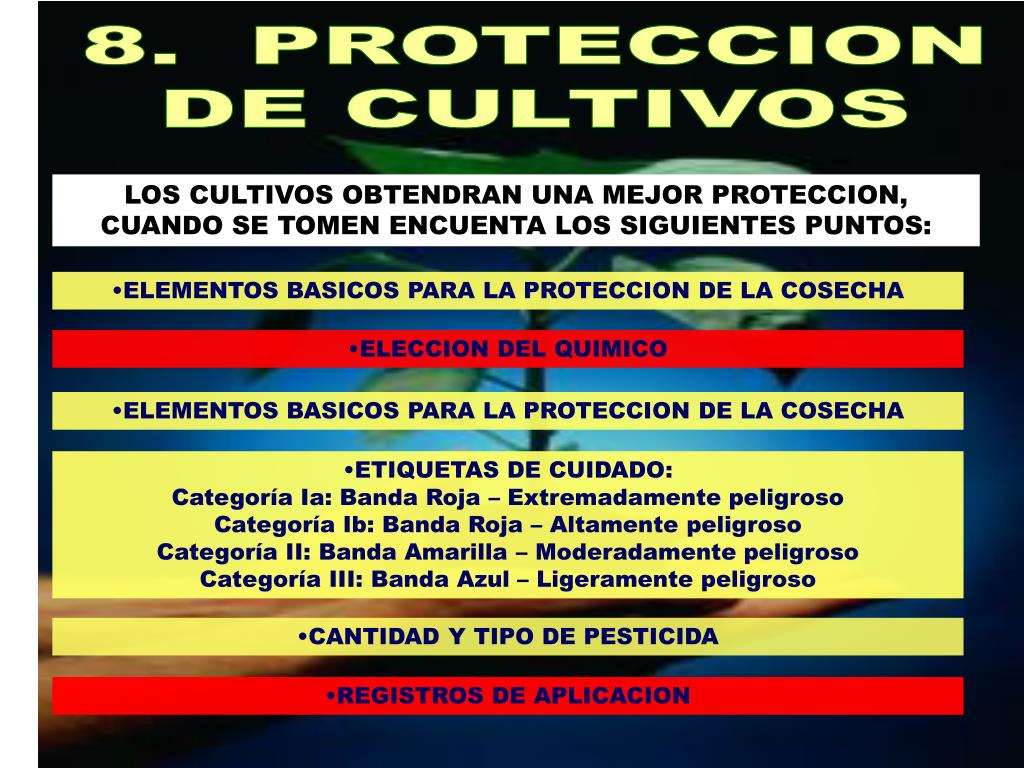 8. PROTECCION DE CULTIVOS LOS CULTIVOS OBTENDRAN UNA MEJOR PROTECCION, CUANDO SE TOMEN ENCUENTA LOS SIGUIENTES PUNTOS: • ELEMENTOS BASICOS PARA LA PROTECCION DE LA COSECHA • ELECCION DEL QUIMICO • ELEMENTOS BASICOS PARA LA PROTECCION DE LA COSECHA • ETIQUETAS DE CUIDADO: • Categoría Ia: Banda Roja – Extremadamente peligroso • Categoría Ib: Banda Roja – Altamente peligroso • Categoría II: Banda Amarilla – Moderadamente peligroso • Categoría III: Banda Azul – Ligeramente peligroso • CANTIDAD Y TIPO DE PESTICIDA • REGISTROS DE APLICACION