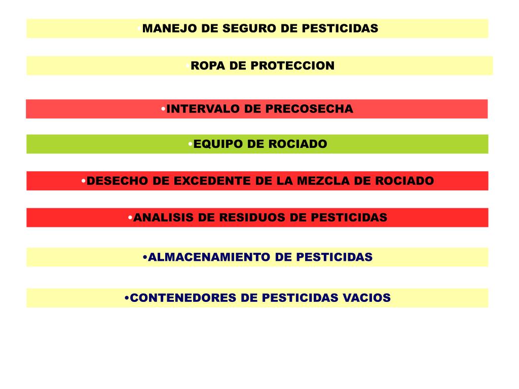 MANEJO DE SEGURO DE PESTICIDAS • ROPA DE PROTECCION • INTERVALO DE PRECOSECHA • EQUIPO DE ROCIADO • DESECHO DE EXCEDENTE DE LA MEZCLA DE ROCIADO • ANALISIS DE RESIDUOS DE PESTICIDAS • ALMACENAMIENTO DE PESTICIDAS • CONTENEDORES DE PESTICIDAS VACIOS