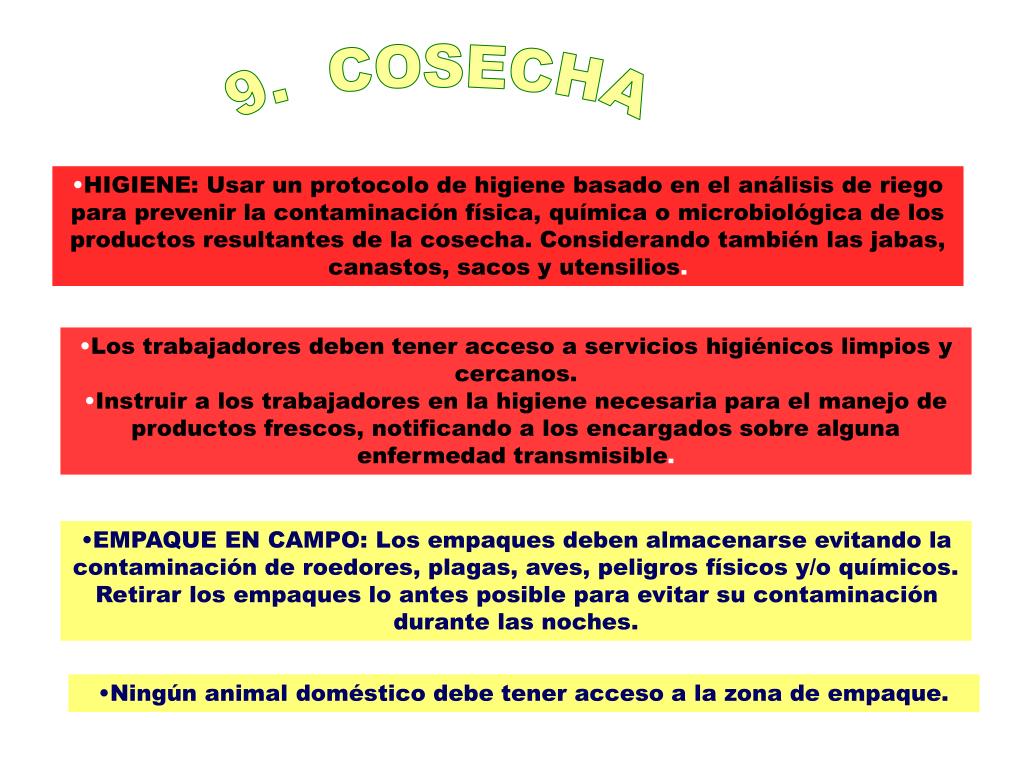 9. COSECHA • HIGIENE: Usar un protocolo de higiene basado en el análisis de riego para prevenir la contaminación física, química o microbiológica de los productos resultantes de la cosecha. Considerando también las jabas, canastos, sacos y utensilios. • Los trabajadores deben tener acceso a servicios higiénicos limpios y cercanos. • Instruir a los trabajadores en la higiene necesaria para el manejo de productos frescos, notificando a los encargados sobre alguna enfermedad transmisible. • EMPAQUE EN CAMPO: Los empaques deben almacenarse evitando la contaminación de roedores, plagas, aves, peligros físicos y/o químicos. Retirar los empaques lo antes posible para evitar su contaminación durante las noches. • Ningún animal doméstico debe tener acceso a la zona de empaque.