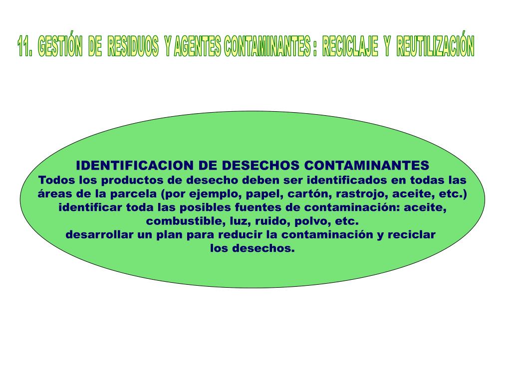 11. GESTIÓN DE RESIDUOS Y AGENTES CONTAMINANTES : RECICLAJE Y REUTILIZACIÓN IDENTIFICACION DE DESECHOS CONTAMINANTES Todos los productos de desecho deben ser identificados en todas las áreas de la parcela (por ejemplo, papel, cartón, rastrojo, aceite, etc.) identificar toda las posibles fuentes de contaminación: aceite, combustible, luz, ruido, polvo, etc. desarrollar un plan para reducir la contaminación y reciclar los desechos.