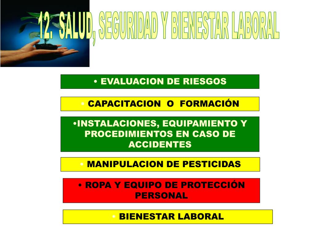 12. SALUD, SEGURIDAD Y BIENESTAR LABORAL • EVALUACION DE RIESGOS • CAPACITACION O FORMACIÓN • INSTALACIONES, EQUIPAMIENTO Y PROCEDIMIENTOS EN CASO DE ACCIDENTES • MANIPULACION DE PESTICIDAS • ROPA Y EQUIPO DE PROTECCIÓN PERSONAL • BIENESTAR LABORAL