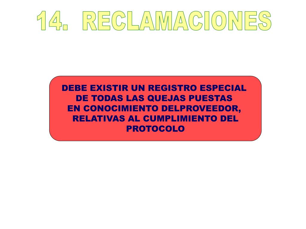 14. RECLAMACIONES DEBE EXISTIR UN REGISTRO ESPECIAL DE TODAS LAS QUEJAS PUESTAS EN CONOCIMIENTO DELPROVEEDOR, RELATIVAS AL CUMPLIMIENTO DEL PROTOCOLO
