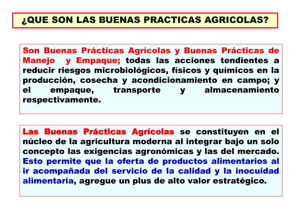¿QUE SON LAS BUENAS PRACTICAS AGRICOLAS? Son Buenas Prácticas Agrícolas y Buenas Prácticas de Manejo y Empaque; todas las acciones tendientes a reducir riesgos microbiológicos, físicos y químicos en la producción, cosecha y acondicionamiento en campo; y el empaque, transporte y almacenamiento respectivamente. Las Buenas Prácticas Agrícolas se constituyen en el núcleo de la agricultura moderna al integrar bajo un solo concepto las exigencias agronómicas y las del mercado. Esto permite que la oferta de productos alimentarios al ir acompañada del servicio de la calidad y la inocuidad alimentaría, agregue un plus de alto valor estratégico.