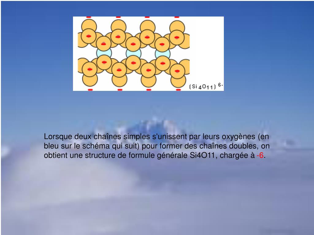 Lorsque deux chaînes simples s'unissent par leurs oxygènes (en bleu sur le schéma qui suit) pour former des chaînes doubles, on obtient une structure de formule générale Si4O11, chargée à -6.