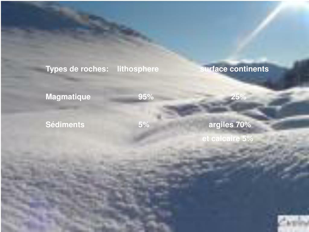Types de roches: lithosphere surface continents Magmatique 95% 25% Sédiments 5% argiles 70% et calcaire 5%