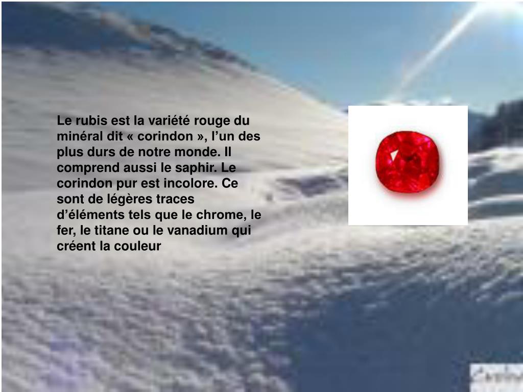 Le rubis est la variété rouge du minéral dit « corindon », l’un des plus durs de notre monde. Il comprend aussi le saphir. Le corindon pur est incolore. Ce sont de légères traces d’éléments tels que le chrome, le fer, le titane ou le vanadium qui créent la couleur