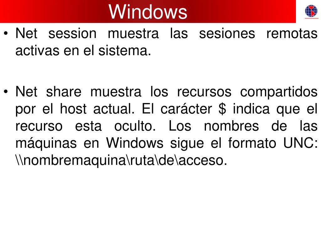 Windows • Net session muestra las sesiones remotas activas en el sistema. • Net share muestra los recursos compartidos por el host actual. El carácter $ indica que el recurso esta oculto. Los nombres de las máquinas en Windows sigue el formato UNC: \\nombremaquina\ruta\de\acceso.