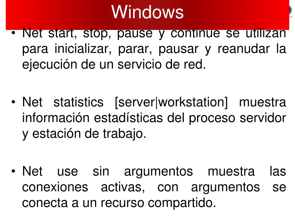 Windows • Net start, stop, pause y continue se utilizan para inicializar, parar, pausar y reanudar la ejecución de un servicio de red. • Net statistics [server|workstation] muestra información estadísticas del proceso servidor y estación de trabajo. • Net use sin argumentos muestra las conexiones activas, con argumentos se conecta a un recurso compartido.