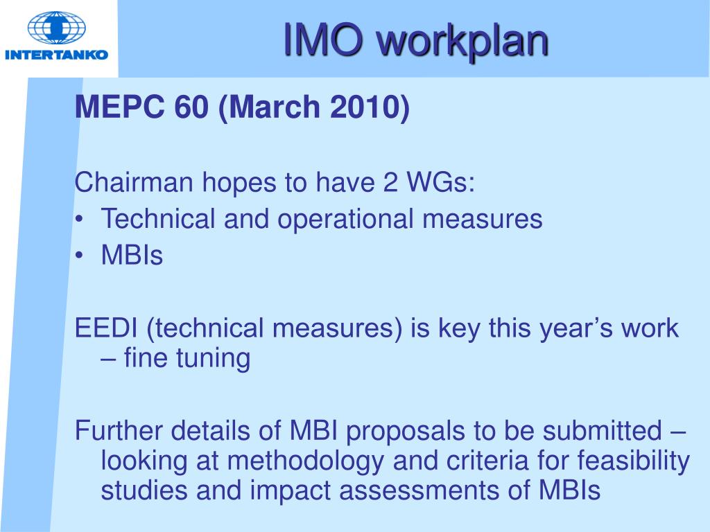 IMO workplan MEPC 60 (March 2010) Chairman hopes to have 2 WGs: • Technical and operational measures • MBIs EEDI (technical measures) is key this year’s work – fine tuning Further details of MBI proposals to be submitted – looking at methodology and criteria for feasibility studies and impact assessments of MBIs
