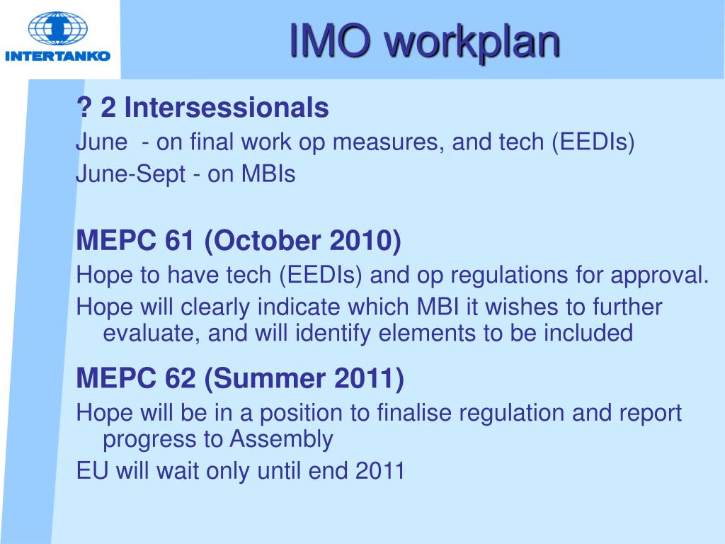 IMO workplan ? 2 Intersessionals June - on final work op measures, and tech (EEDIs) June-Sept - on MBIs MEPC 61 (October 2010) Hope to have tech (EEDIs) and op regulations for approval. Hope willclearly indicate which MBI it wishes to further evaluate, and will identify elements to be included MEPC 62 (Summer 2011) Hope will be in a positionto finalise regulation and report progress to Assembly EU will wait only until end 2011