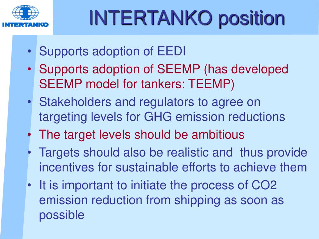 INTERTANKO position • Supports adoption of EEDI • Supports adoption of SEEMP (has developed SEEMP model for tankers: TEEMP) • Stakeholders and regulators to agree on targeting levels for GHG emission reductions • The target levels should be ambitious • Targets should also be realistic and thus provide incentives for sustainable efforts to achieve them • It is important to initiate the process of CO2 emission reduction from shipping as soon as possible