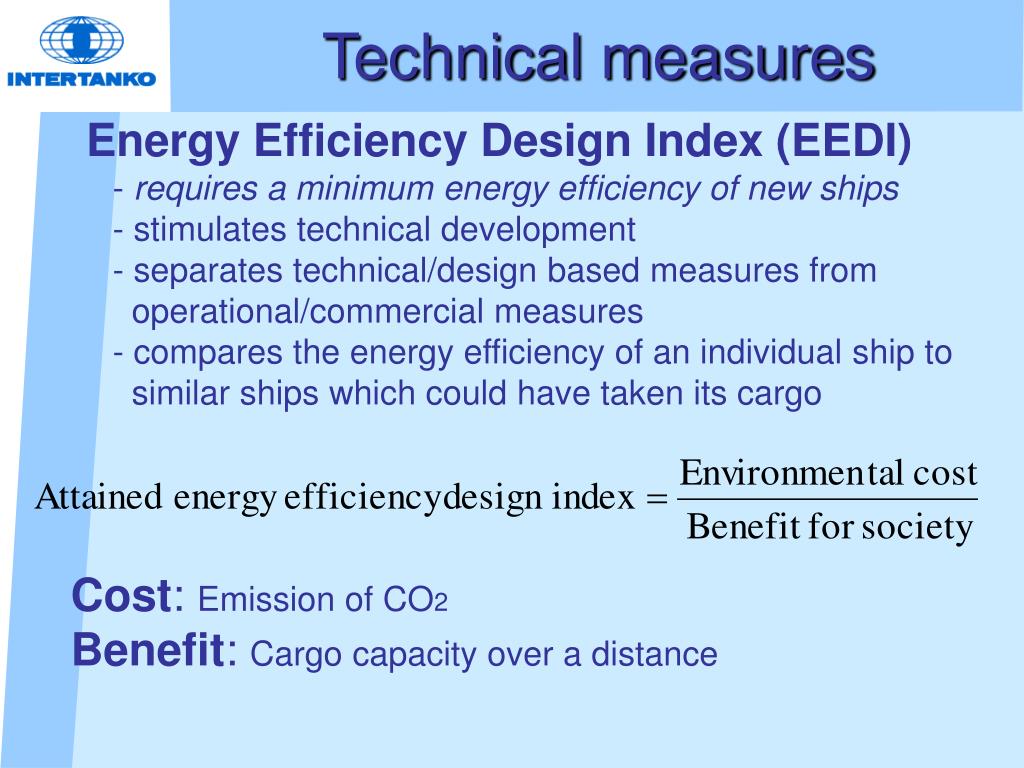 Technical measures • Energy Efficiency Design Index (EEDI) • - requires a minimum energy efficiency of new ships • - stimulates technical development • - separates technical/design based measures from • operational/commercial measures • - compares the energy efficiency of an individual ship to • similar ships which could have taken its cargo Cost: Emission of CO2 Benefit: Cargo capacity over a distance