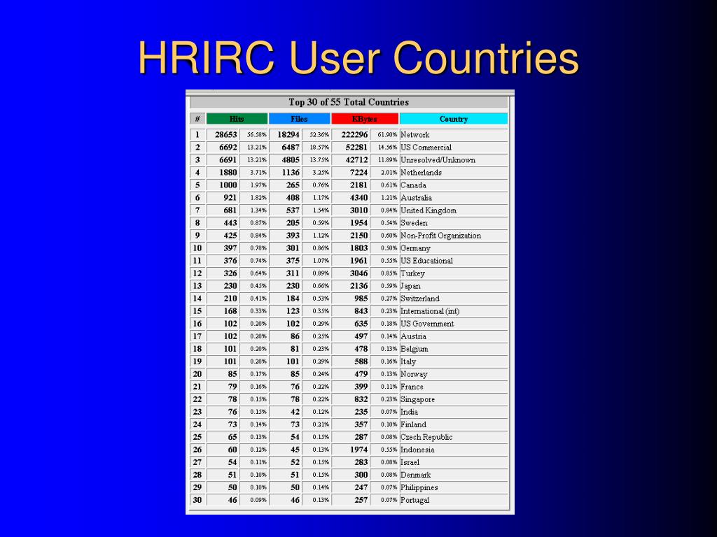 HRIRC Usage October statistics: • 3048 different visits to the website • Visitors came from 1346 different locations • On average, 360 different pages of information read every day