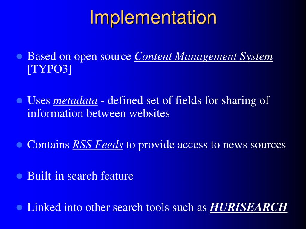 Implementation • Based on open source Content Management System [TYPO3] • Uses metadata - defined set of fields for sharing of information between websites • Contains RSS Feeds to provide access to news sources • Built-in search feature • Linked into other search tools such as HURISEARCH