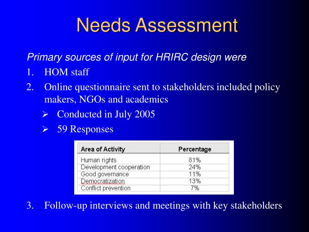 Needs Assessment Primary sources of input for HRIRC design were • HOM staff • Online questionnaire sent to stakeholders included policy makers, NGOs and academics • Conducted in July 2005 • 59 Responses • Follow-up interviews and meetings with key stakeholders