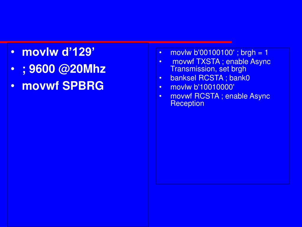 movlw d’129’ ; 9600 @20Mhz movwf SPBRG movlw b'00100100' ; brgh = 1 movwf TXSTA ; enable Async Transmission, set brgh banksel RCSTA ; bank0 movlw b'10010000' movwf RCSTA ; enable Async Reception