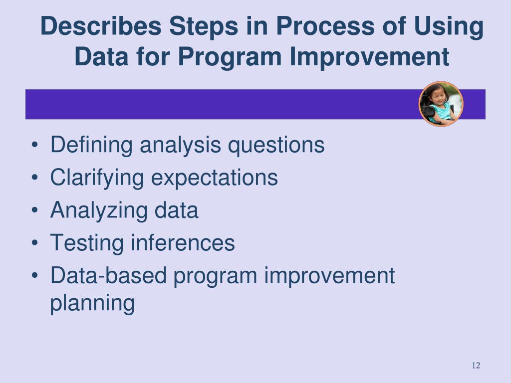 Describes Steps in Process of Using Data for Program Improvement • Defining analysis questions • Clarifying expectations • Analyzing data • Testing inferences • Data-based program improvement planning