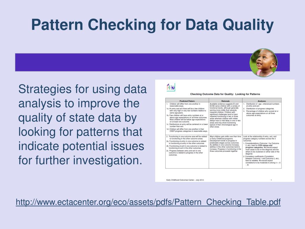Pattern Checking for Data Quality Strategies for using data analysis to improve the quality of state data by looking for patterns that indicate potential issues for further investigation. http://www.ectacenter.org/eco/assets/pdfs/Pattern_Checking_Table.pdf