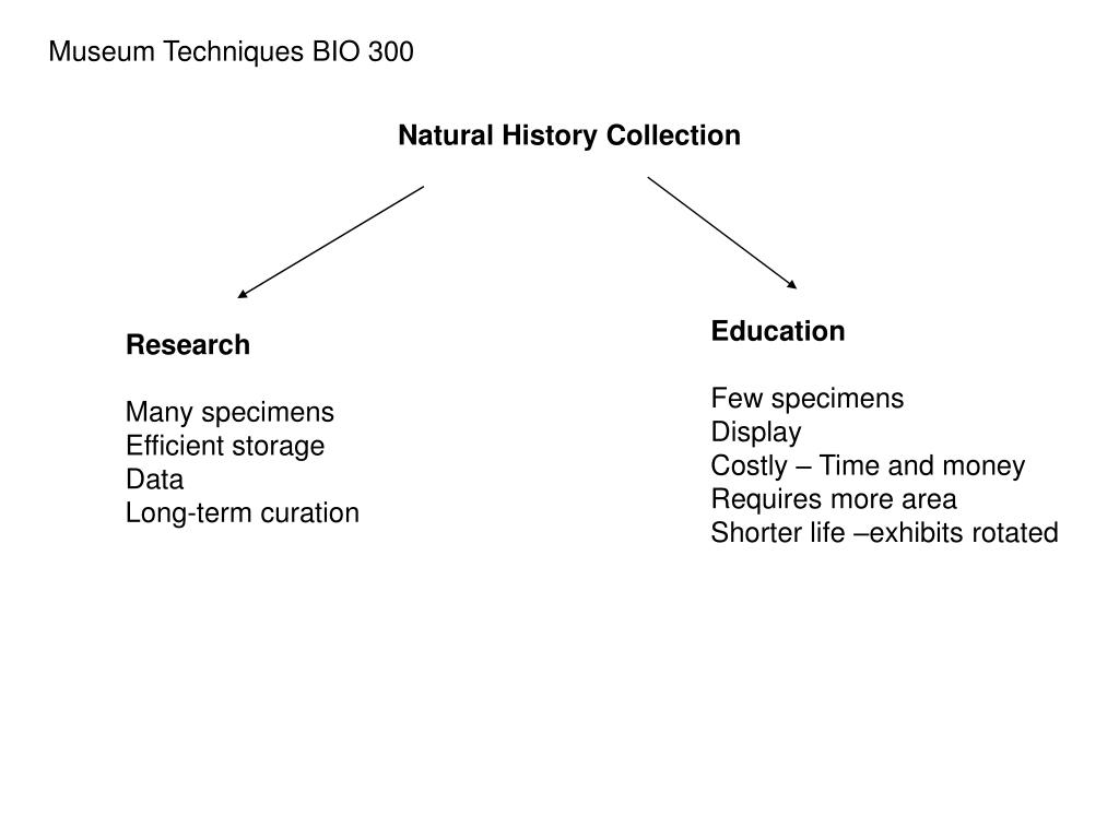 Museum Techniques BIO 300 Natural History Collection Education Few specimens Display Costly – Time and money Requires more area Shorter life –exhibits rotated Research Many specimens Efficient storage Data Long-term curation