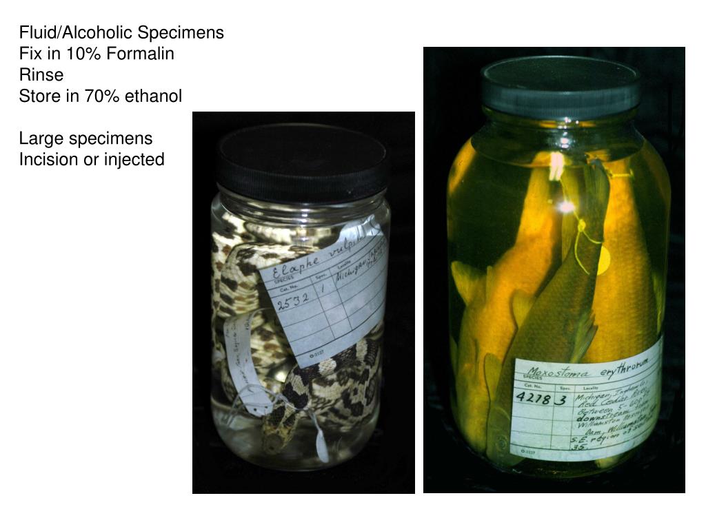 Fluid/Alcoholic Specimens Fix in 10% Formalin Rinse Store in 70% ethanol Large specimens Incision or injected