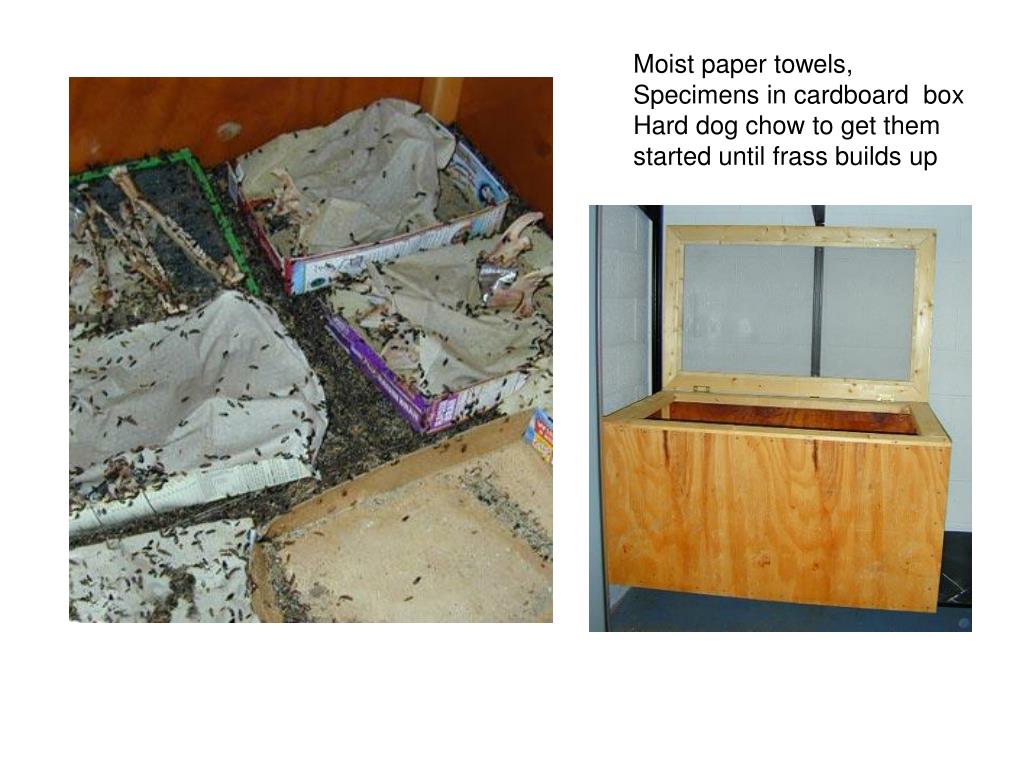 Moist paper towels, Specimens in cardboard box Hard dog chow to get them started until frass builds up