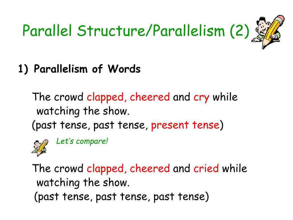 Parallel Structure/Parallelism (2) • Parallelism of Words The crowd clapped, cheered and cry while watching the show. (past tense, past tense, present tense) Let’s compare! The crowd clapped, cheered and cried while watching the show. (past tense, past tense, past tense)