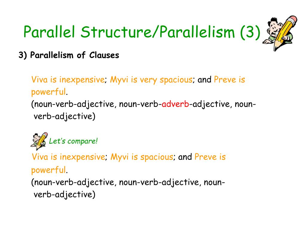 Parallel Structure/Parallelism (3) 3) Parallelism of Clauses Viva is inexpensive; Myvi is very spacious; and Preve is powerful. (noun-verb-adjective, noun-verb-adverb-adjective, noun- verb-adjective) Let’s compare! Viva is inexpensive; Myvi is spacious; and Preve is powerful. (noun-verb-adjective, noun-verb-adjective, noun- verb-adjective)