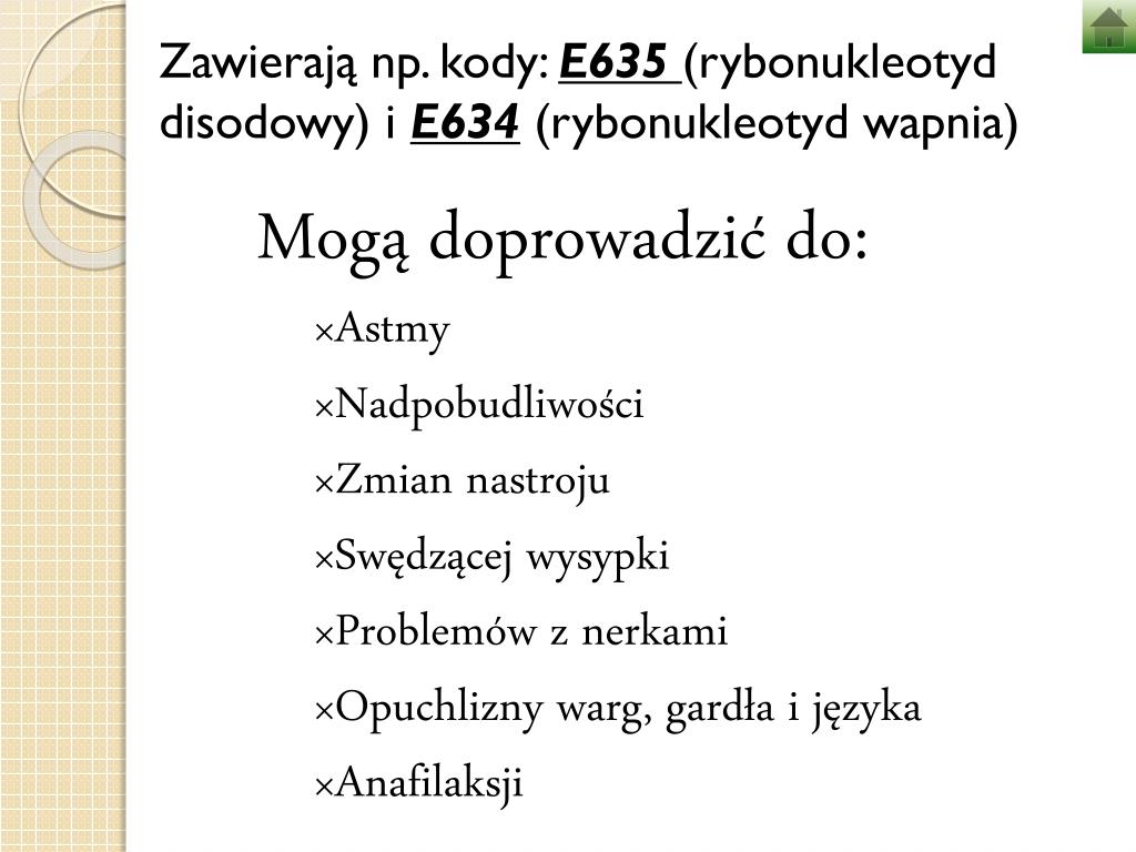Zawierają np. kody: E635 (rybonukleotyddisodowy) i E634 (rybonukleotyd wapnia) • Mogą doprowadzić do: • Astmy • Nadpobudliwości • Zmian nastroju • Swędzącej wysypki • Problemów z nerkami • Opuchlizny warg, gardła i języka • Anafilaksji