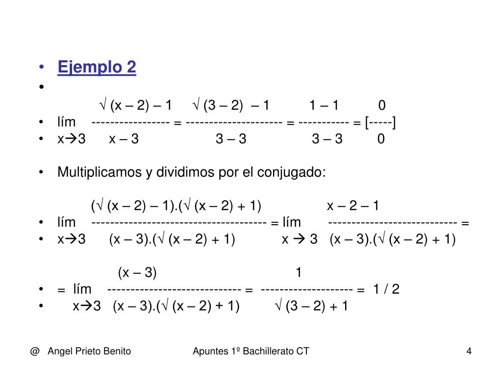 Ejemplo 2 √ (x – 2) – 1 √ (3 – 2) – 1 1 – 1 0 • lím ‑‑‑‑‑‑‑---------- = --------------------- = ----------- = [-----] • x3 x – 3 3 – 3 3 – 3 0 • Multiplicamos y dividimos por el conjugado: (√ (x – 2) – 1).(√ (x – 2) + 1) x – 2 – 1 • lím ‑‑‑‑‑‑‑------------------------------- = lím ---------------------------- = • x3 (x – 3).(√ (x – 2) + 1) x 3 (x – 3).(√ (x – 2) + 1) (x – 3) 1 • = lím ‑‑‑‑‑‑‑---------------------- = -------------------- = 1 / 2 • x3 (x – 3).(√ (x – 2) + 1) √ (3 – 2) + 1 Apuntes 1º Bachillerato CT