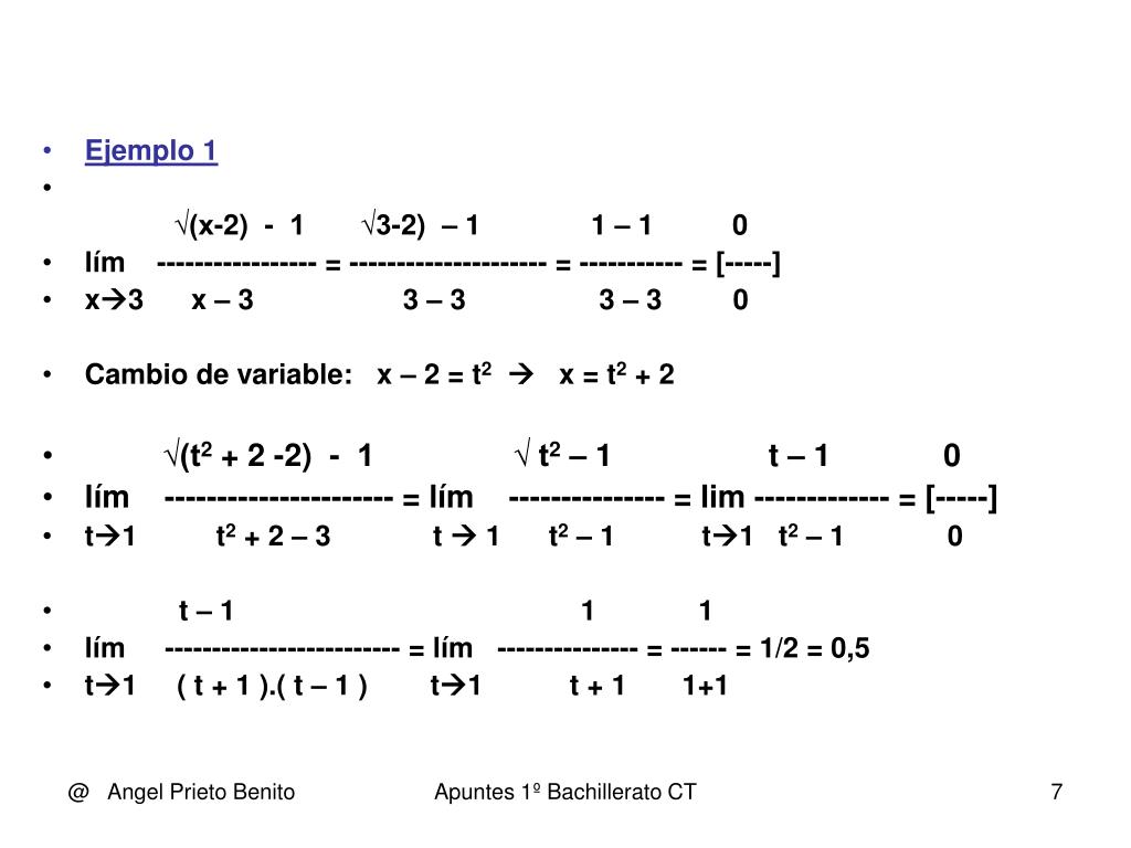 Ejemplo 1 √(x-2) - 1 √3-2) – 1 1 – 1 0 • lím ‑‑‑‑‑‑‑---------- = --------------------- = ----------- = [-----] • x3 x – 3 3 – 3 3 – 3 0 • Cambio de variable: x – 2 = t2 x = t2+ 2 • √(t2+ 2 -2) - 1 √ t2– 1 t – 1 0 • lím ‑‑‑‑‑‑‑--------------- = lím --------------- = lim ------------- = [-----] • t1 t2+ 2 – 3 t 1 t2– 1 t1 t2– 1 0 • t – 1 1 1 • lím ‑‑‑‑‑‑‑‑----------------- = lím --------------- = ------ = 1/2 = 0,5 • t1 ( t + 1 ).( t – 1 ) t1 t + 1 1+1 Apuntes 1º Bachillerato CT