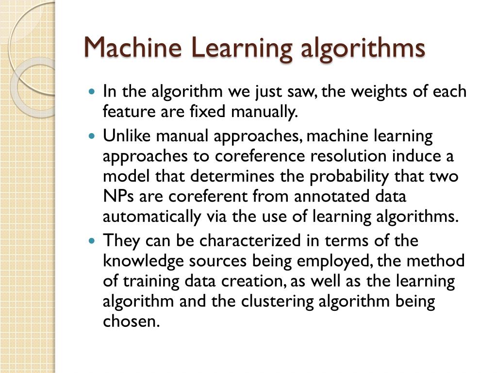 Machine Learning algorithms • In the algorithm we just saw, the weights of each feature are fixed manually. • Unlike manual approaches, machine learning approaches to coreference resolution induce a model that determines the probability that two NPs are coreferent from annotated data automatically via the use of learning algorithms. • They can be characterized in terms of the knowledge sources being employed, the method of training data creation, as well as the learning algorithm and the clustering algorithm being chosen.