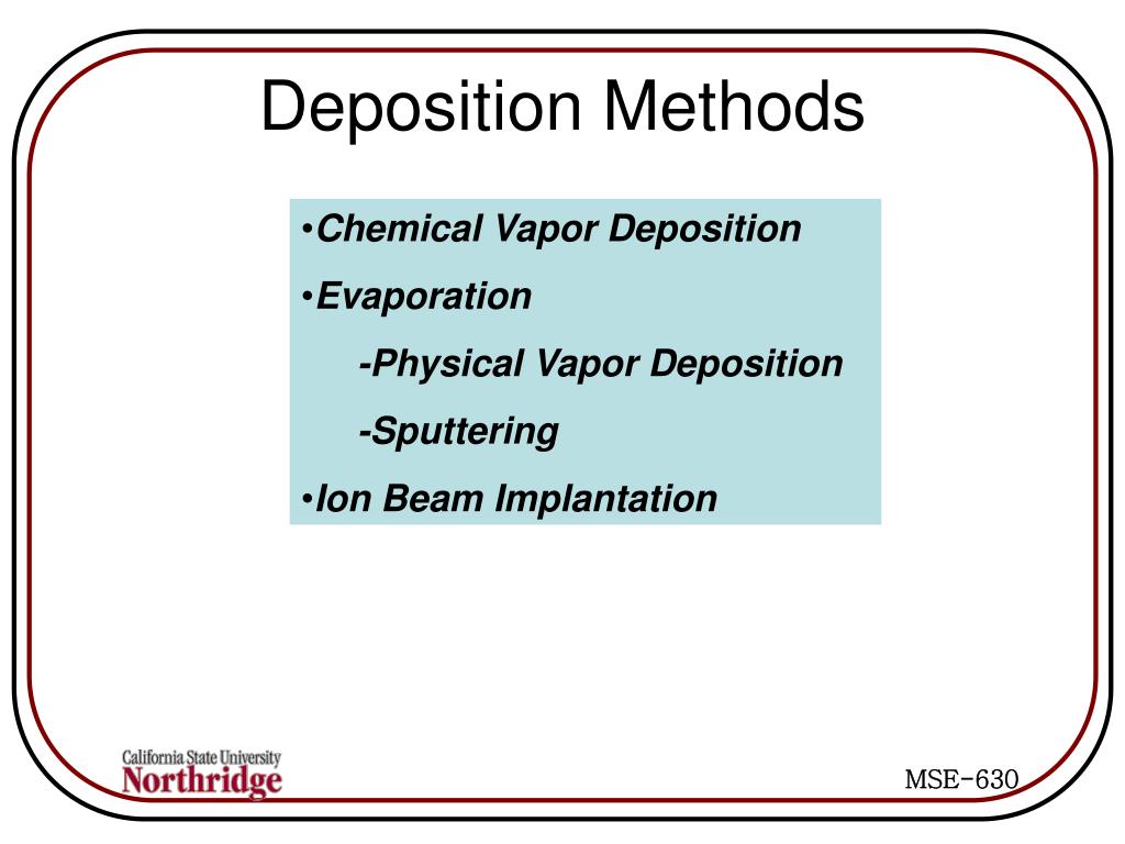 Deposition Methods • Chemical Vapor Deposition • Evaporation • -Physical Vapor Deposition • -Sputtering • Ion Beam Implantation