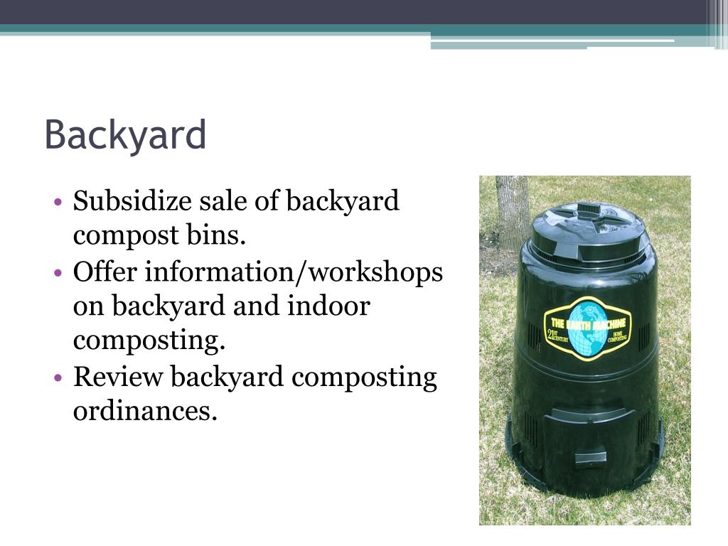Backyard • Subsidize sale of backyard compost bins. • Offer information/workshops on backyard and indoor composting. • Review backyard composting ordinances.