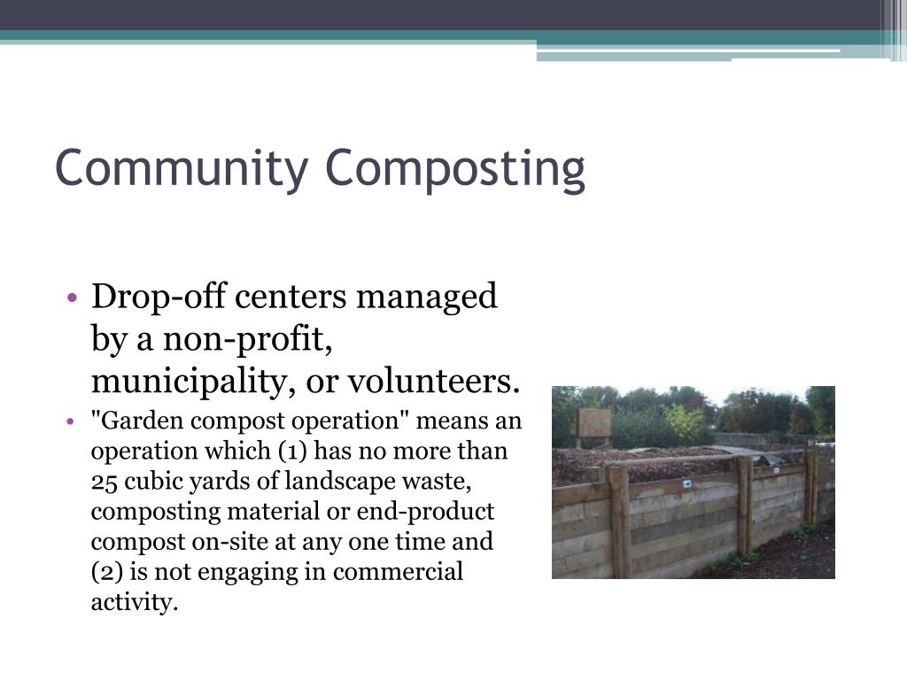 Community Composting • Drop-off centers managed by a non-profit, municipality, or volunteers. • "Garden compost operation" means an operation which (1) has no more than 25 cubic yards of landscape waste, composting material or end-product compost on-site at any one time and (2) is not engaging in commercial activity.