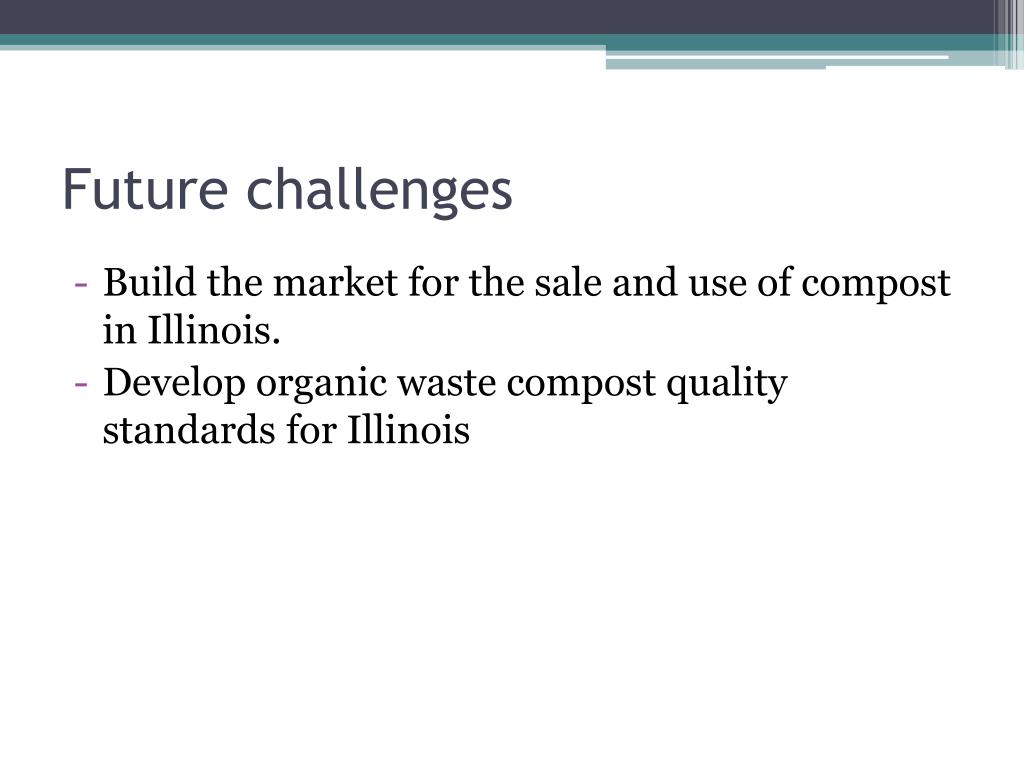 Future challenges • Build the market for the sale and use of compost in Illinois. • Develop organic waste compost quality standards for Illinois