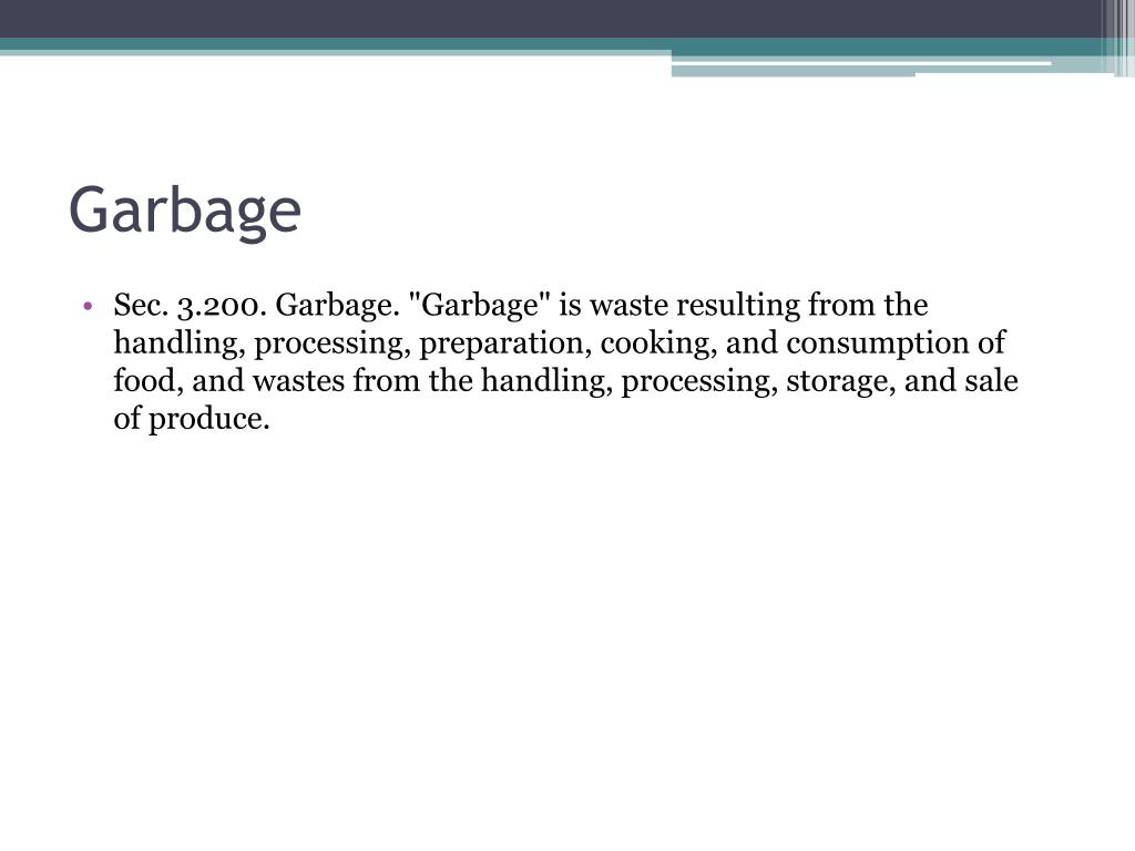 Garbage • Sec. 3.200. Garbage. "Garbage" is waste resulting from the handling, processing, preparation, cooking, and consumption of food, and wastes from the handling, processing, storage, and sale of produce.