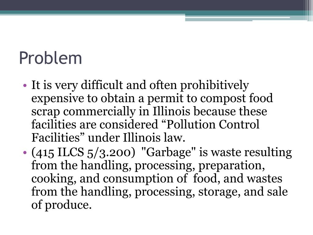 Problem • It is very difficult and often prohibitively expensive to obtain a permit to compost food scrap commercially in Illinois because these facilities are considered “Pollution Control Facilities” under Illinois law. • (415 ILCS 5/3.200) "Garbage" is waste resulting from the handling, processing, preparation, cooking, and consumption of food, and wastes from the handling, processing, storage, and sale of produce.