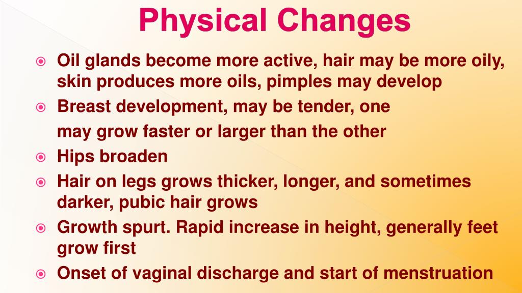 Physical Changes • Oil glands become more active, hair may be more oily, skin produces more oils, pimples may develop • Breast development, may be tender, one may grow faster or larger than the other • Hips broaden • Hair on legs grows thicker, longer, and sometimes darker, pubic hair grows • Growth spurt. Rapid increase in height, generally feet grow first • Onset of vaginal discharge and start of menstruation