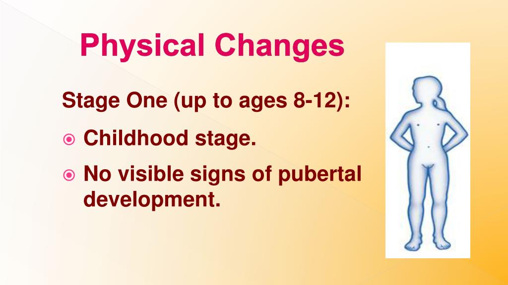 Physical Changes Stage One (up to ages 8-12): • Childhood stage. • No visible signs of pubertal development.