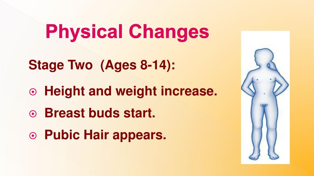 Physical Changes Stage Two (Ages 8-14): • Height and weight increase. • Breast buds start. • Pubic Hair appears.