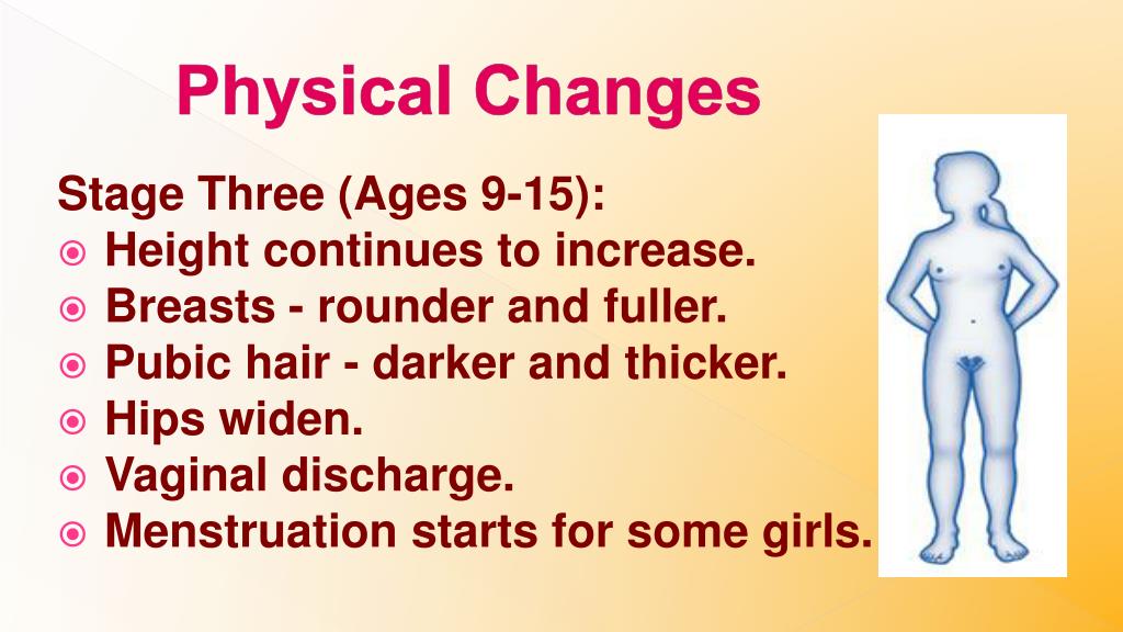 Physical Changes Stage Three (Ages 9-15): • Height continues to increase. • Breasts - rounder and fuller. • Pubic hair - darker and thicker. • Hips widen. • Vaginal discharge. • Menstruation starts for some girls.