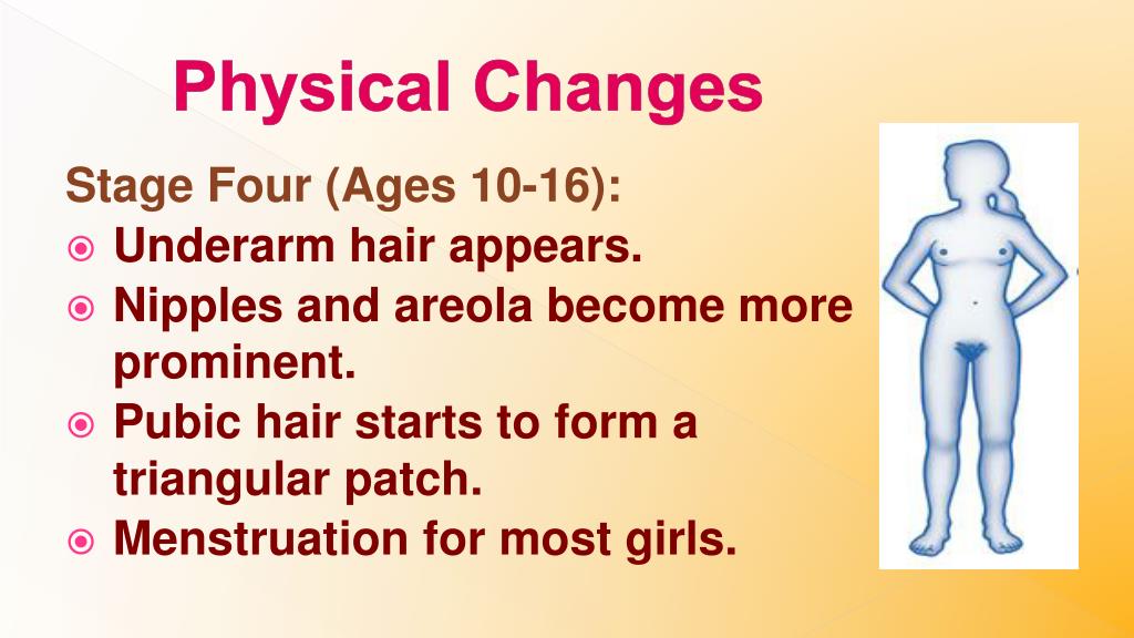 Physical Changes Stage Four (Ages 10-16): • Underarm hair appears. • Nipples and areola become more prominent. • Pubic hair starts to form a triangular patch. • Menstruation for most girls.